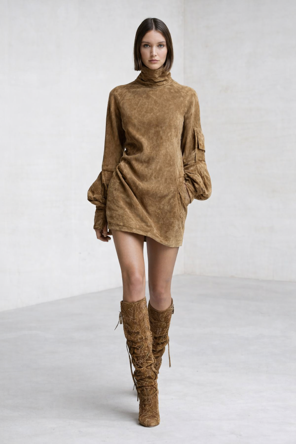 Beli ║ Minivestido holgado de ante con cuello alto